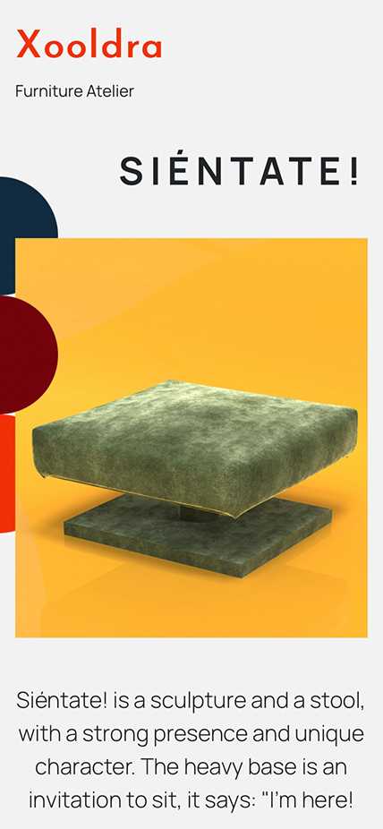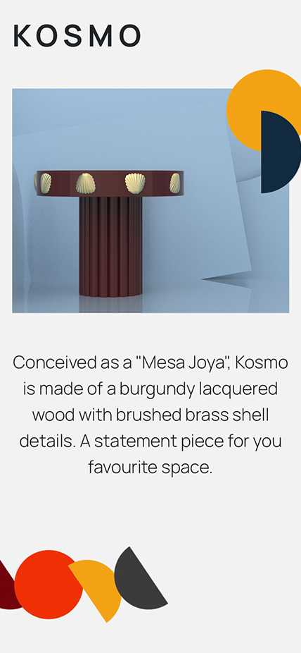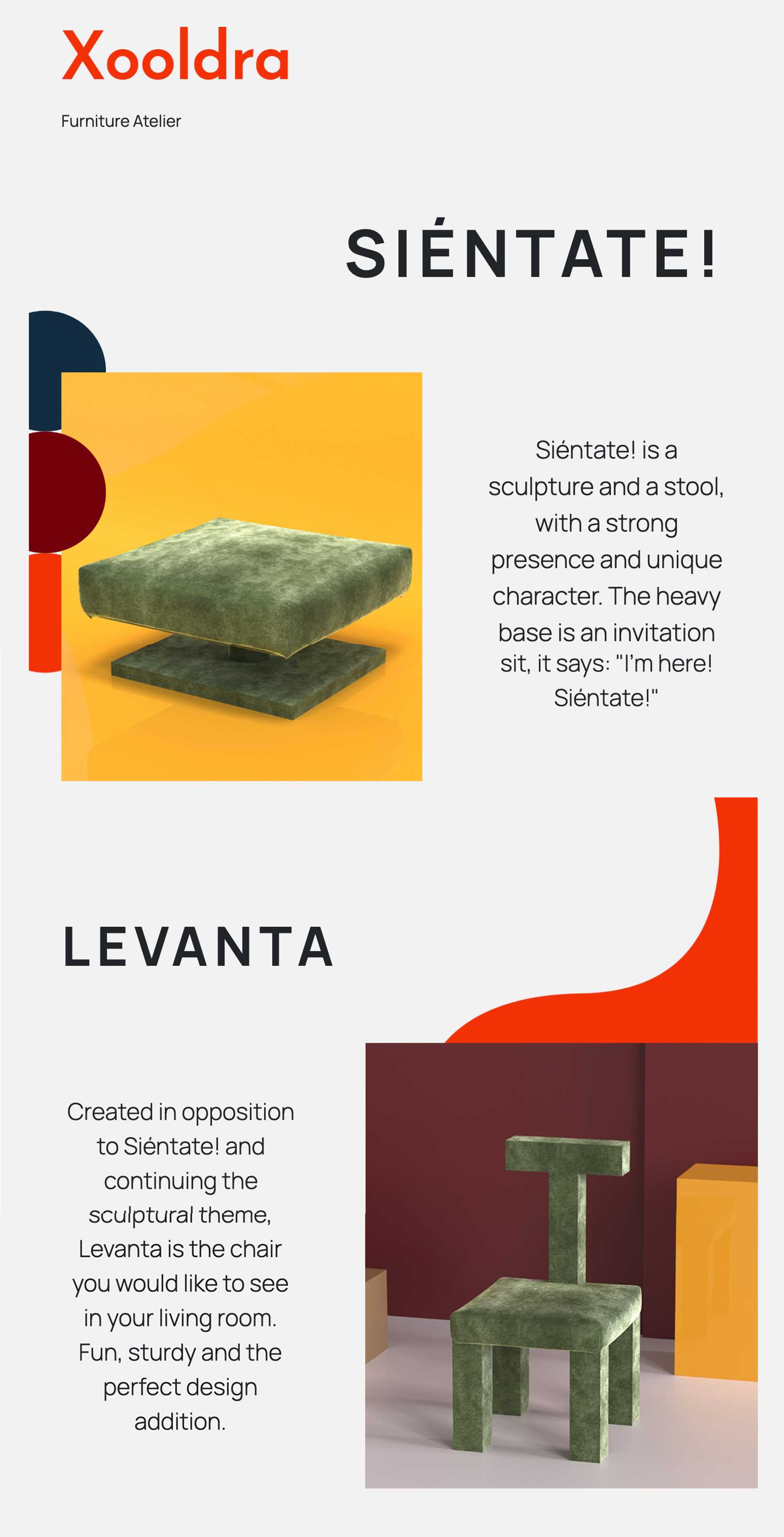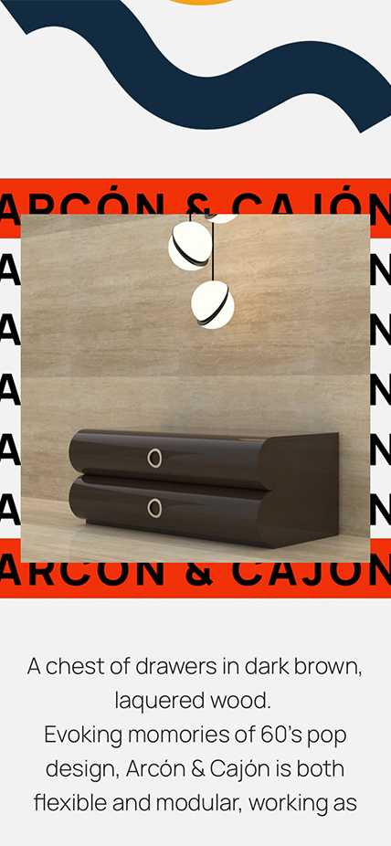 Lively shapes and Javascript/CSS animations play in harmony with the showcased furniture pieces.